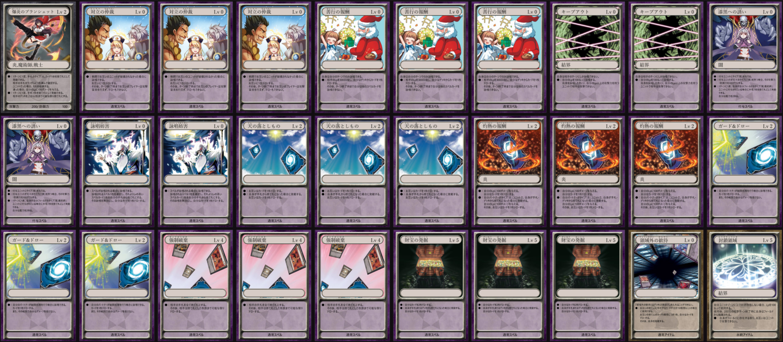 〈天落の邪神官 サン〉は小粒ユニットを処理するため、〈復讐の亡霊〉は捨て札に落ちても防御力を下げ〈ボルテック・センチピート〉の効果で破壊できるため採用。最近はLv1やLv2ユニットの展開も多いため、防御力を100下げる効果は優秀と判断。